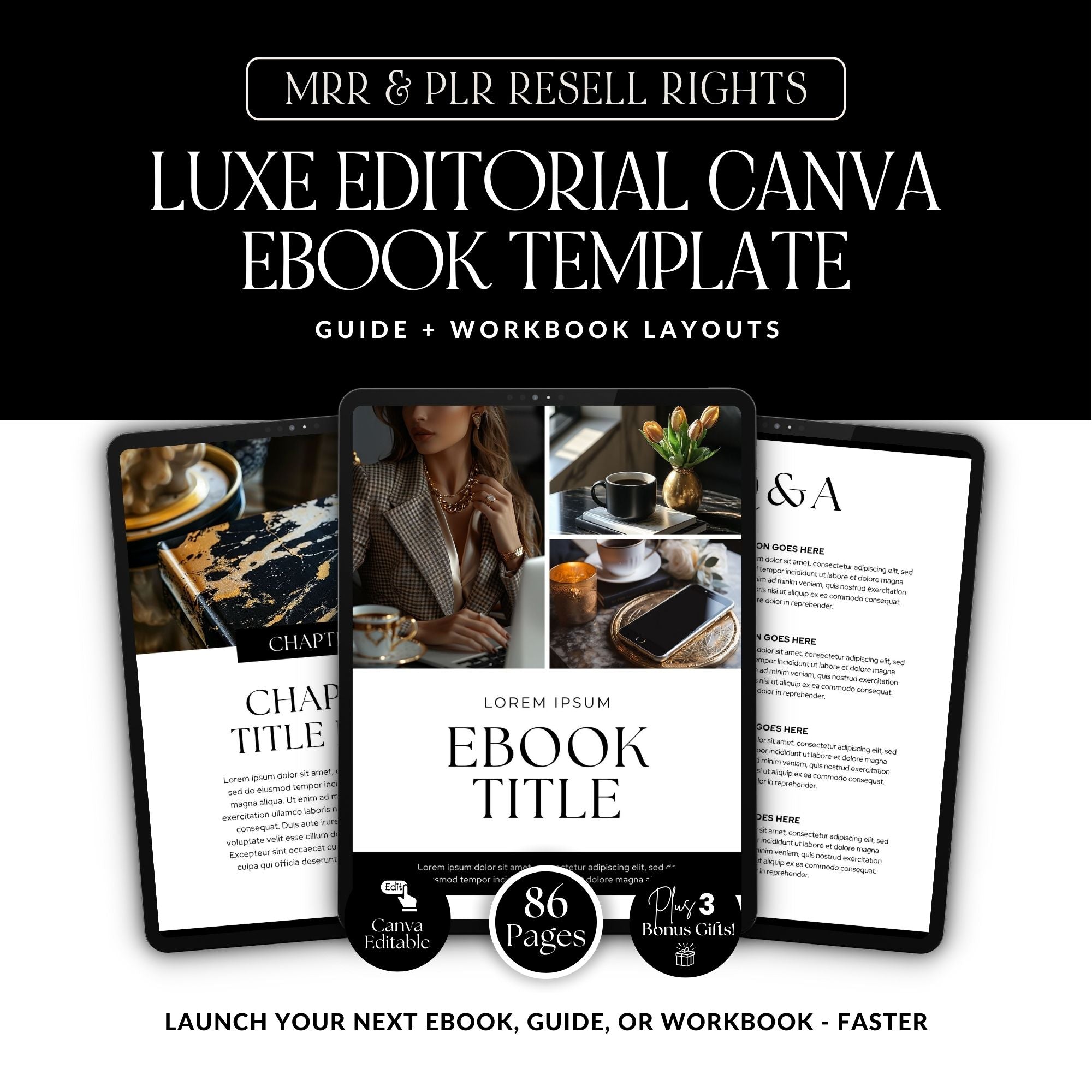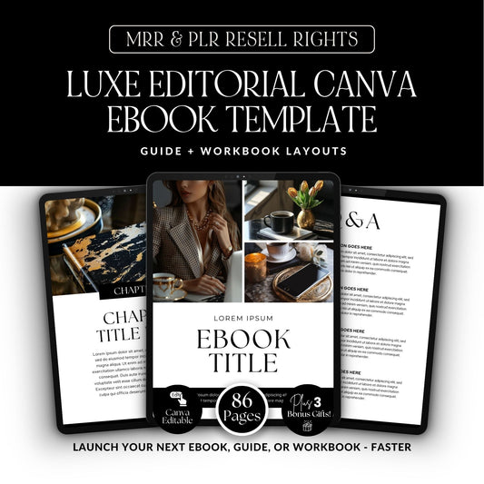 Canva eBook Template (Luxe Editorial) + Workbook & Guide Layouts | MRR + PLR + Bonus Black & Gold Stock Photos