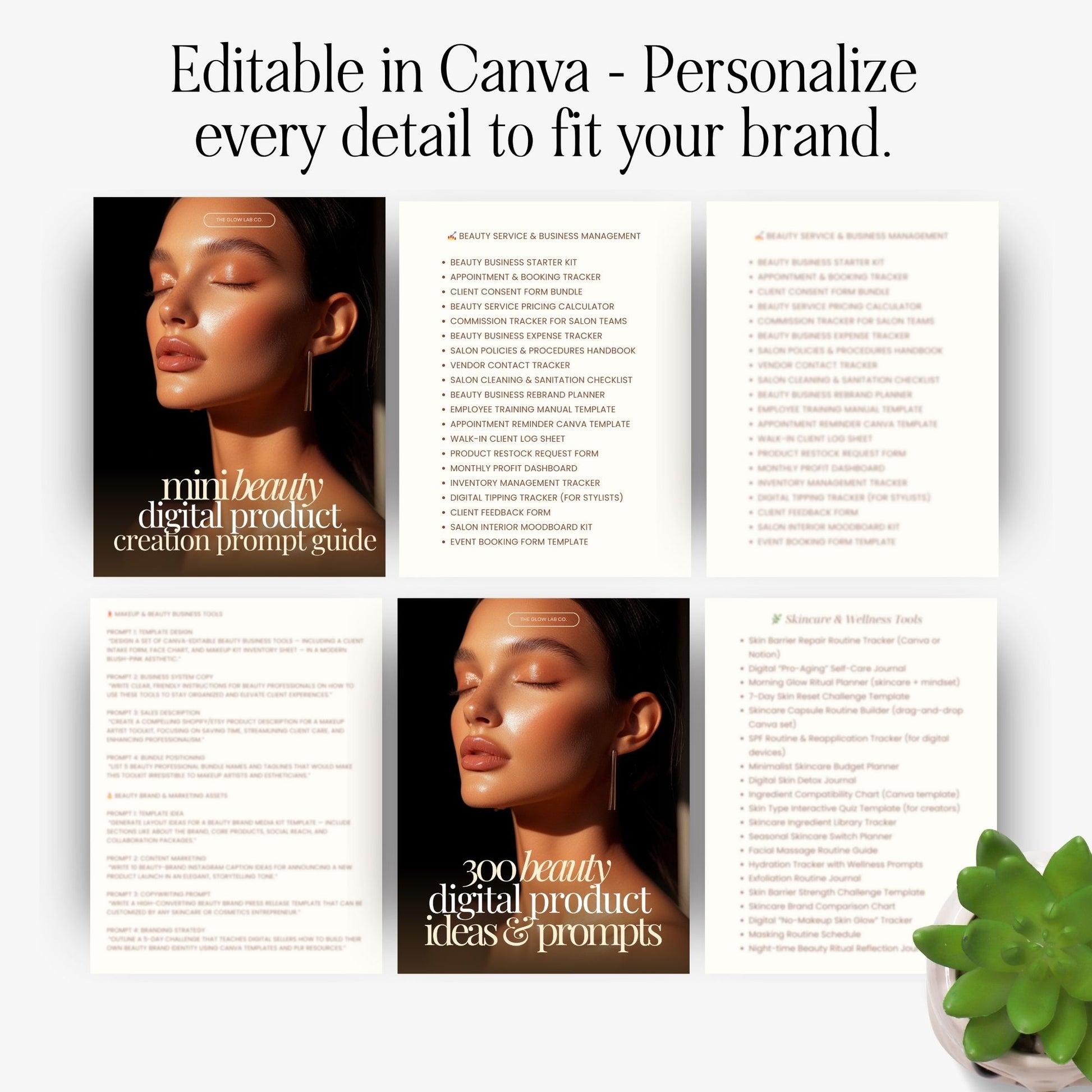 * Canva-editable guide: 300 Beauty Digital Product Ideas + Prompts (26 pages)