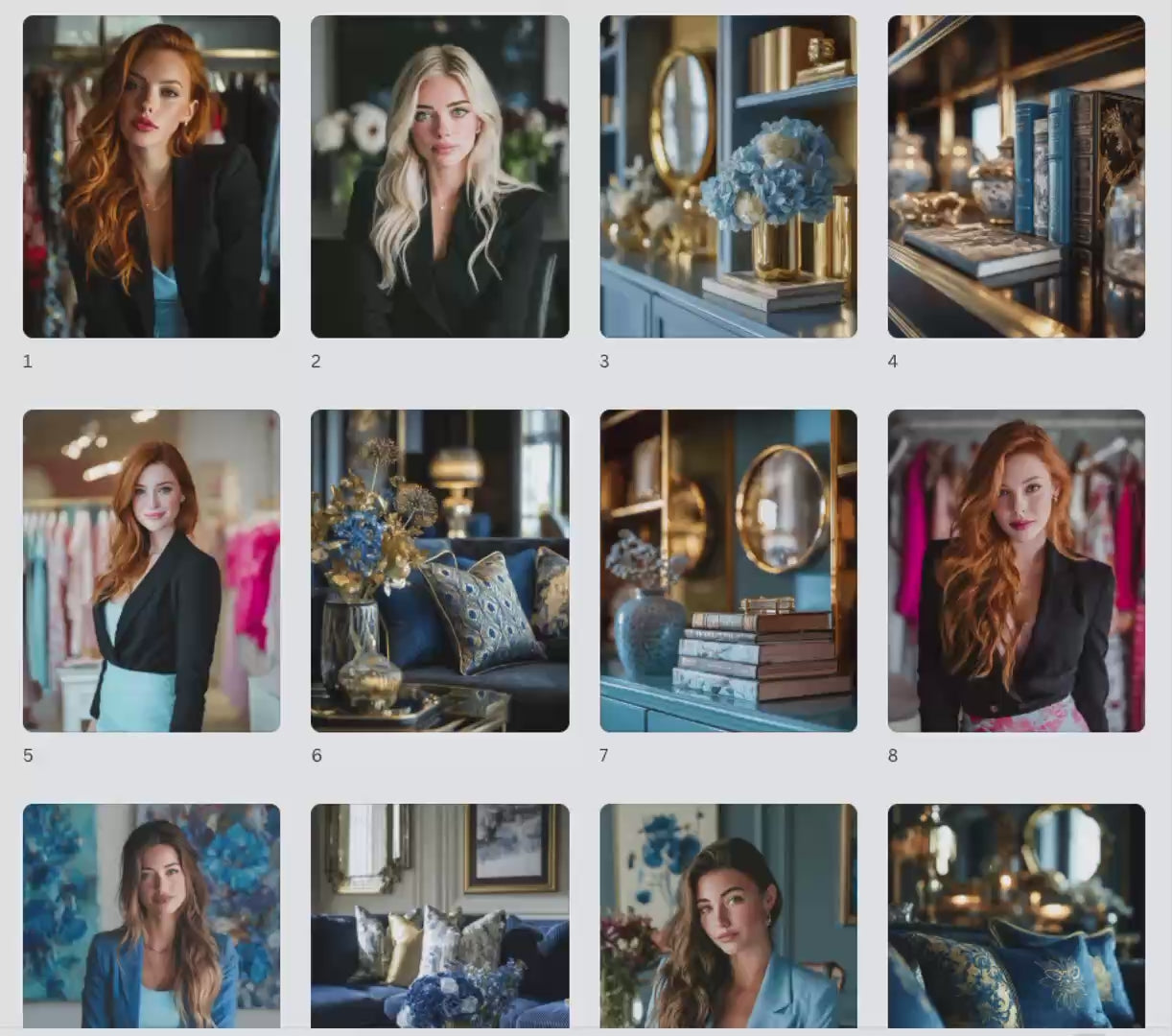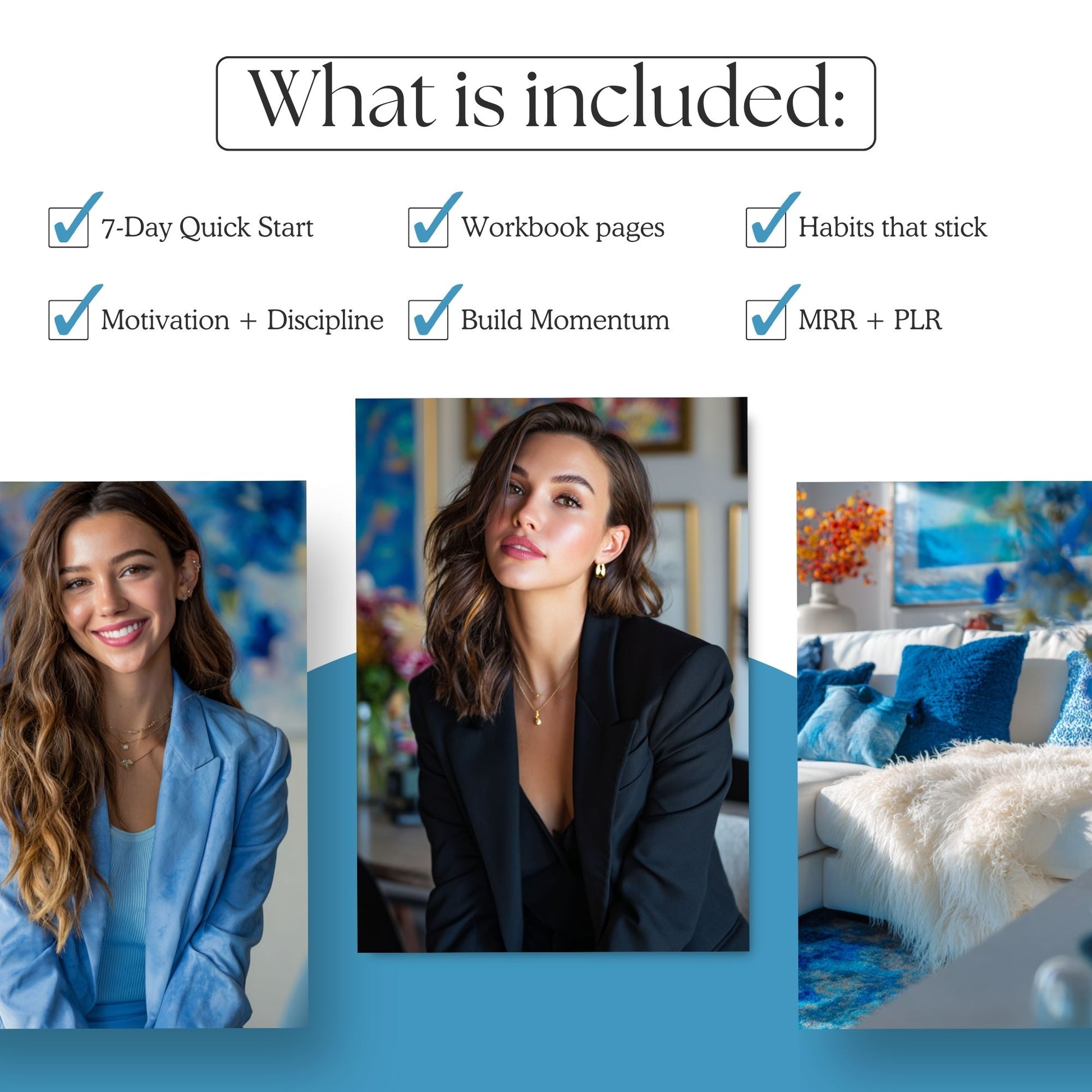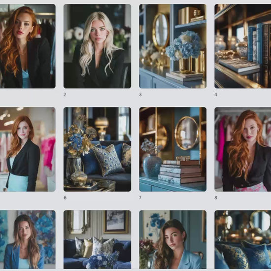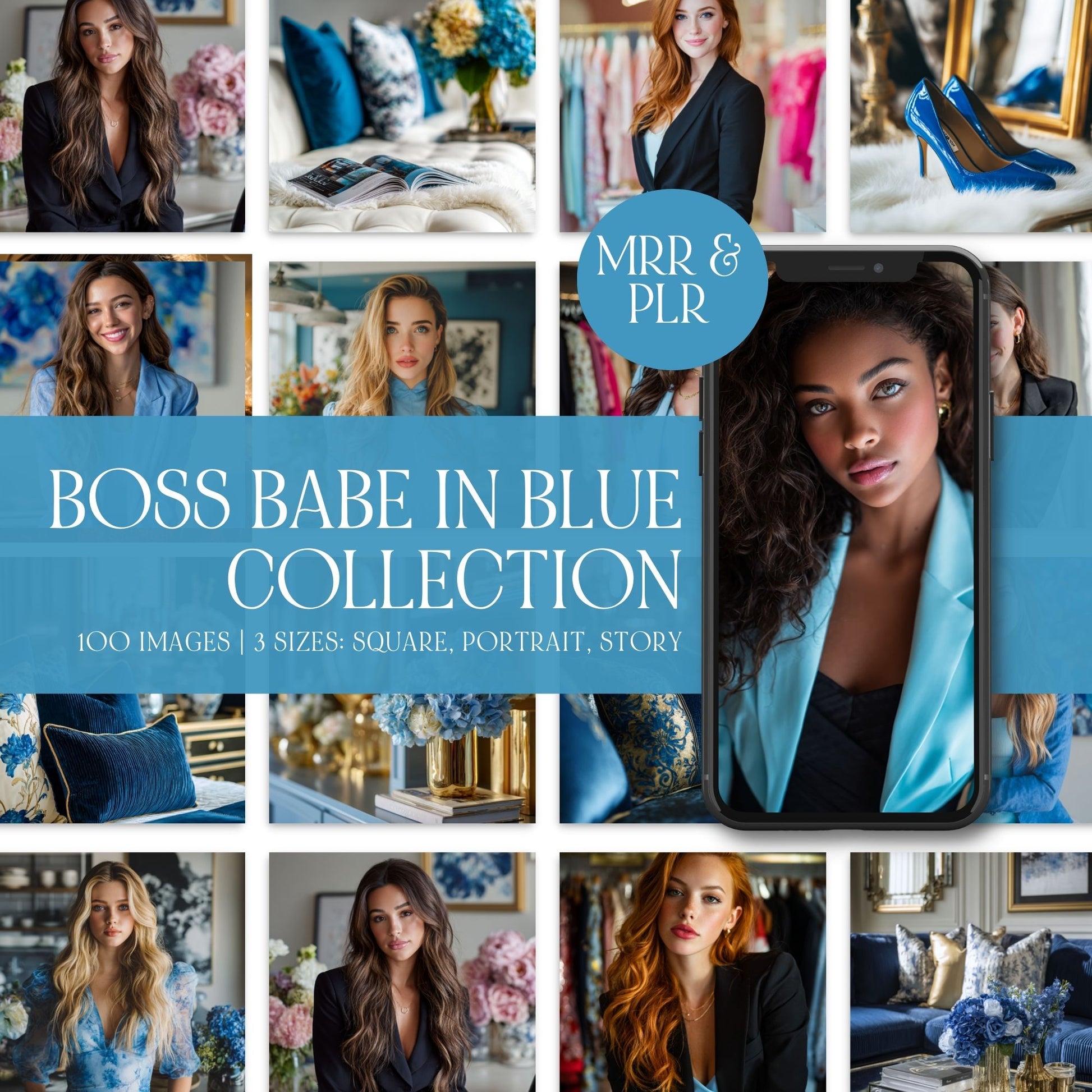 Looking for blue aesthetic stock photos with a luxury feel? This Boss Babe in Blue bundle includes 100 stunning images—featuring stylish women, elegant interiors, and blue floral accents—in 3 ready-to-post sizes for Instagram, Pinterest, and digital products.