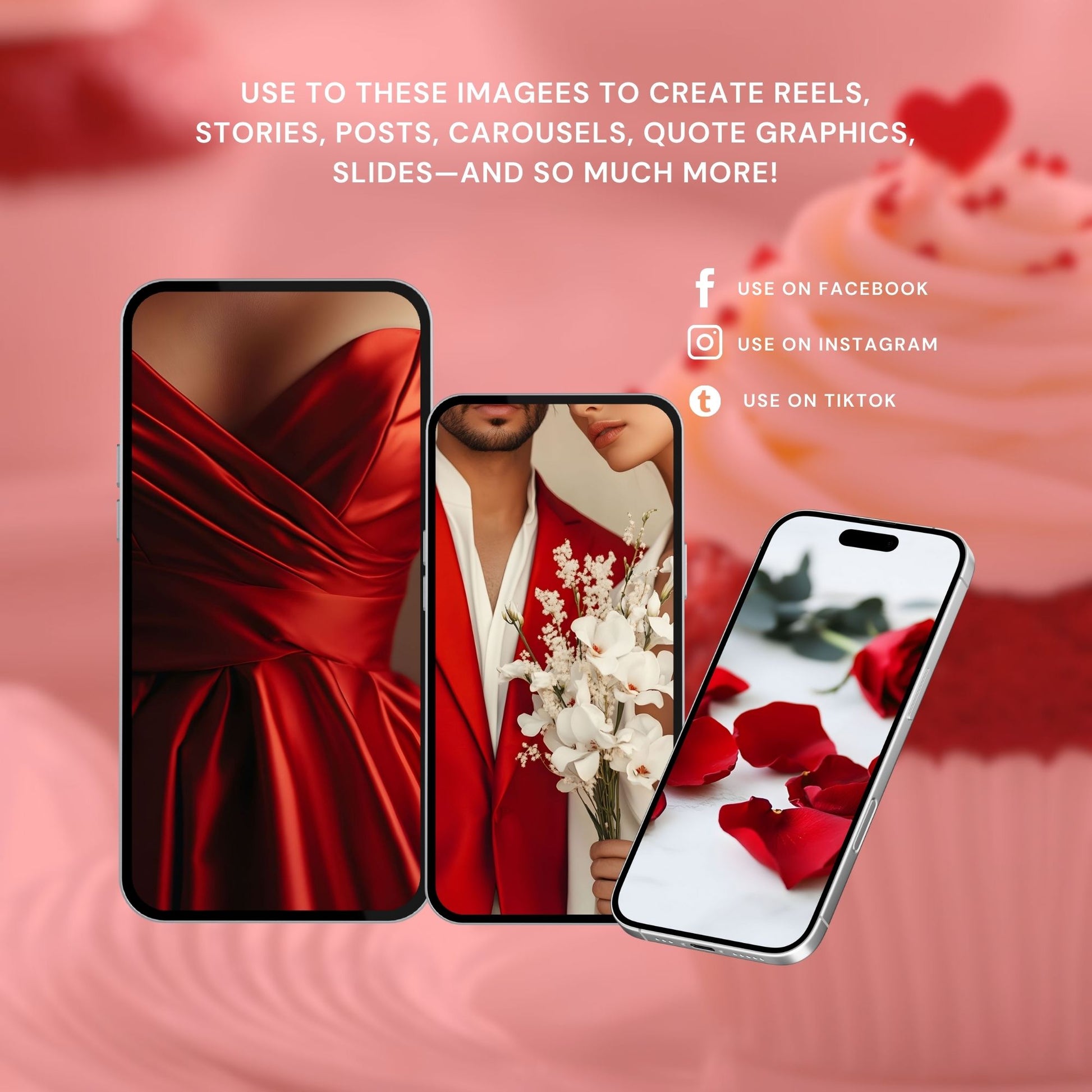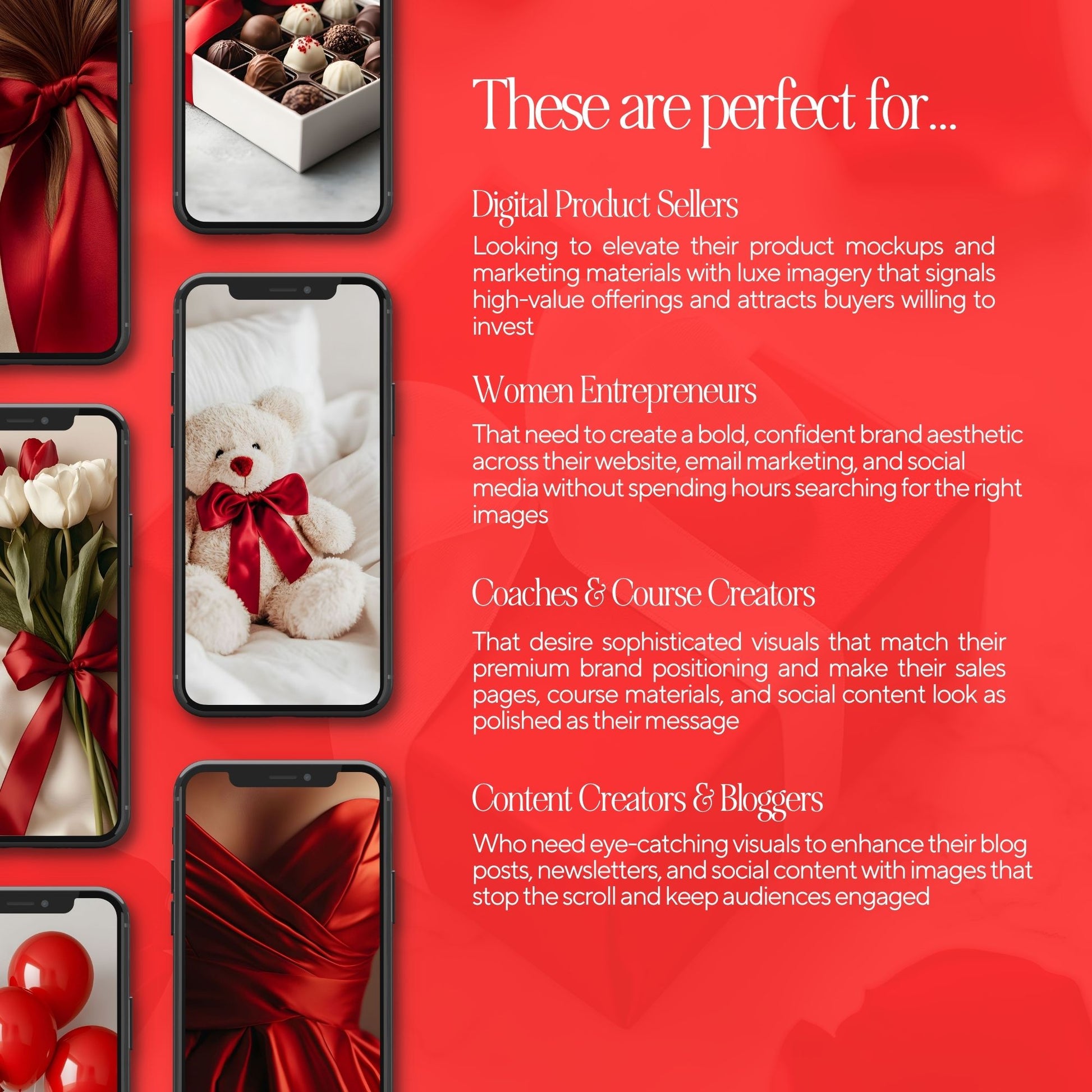 Get 100 romantic, red-themed AI stock images designed for Instagram, Pinterest, Etsy, email campaigns, product mockups, and more. Three ready-to-use sizes are included, plus full MRR + PLR resell rights so you can use them for your brand or resell as your own digital product.